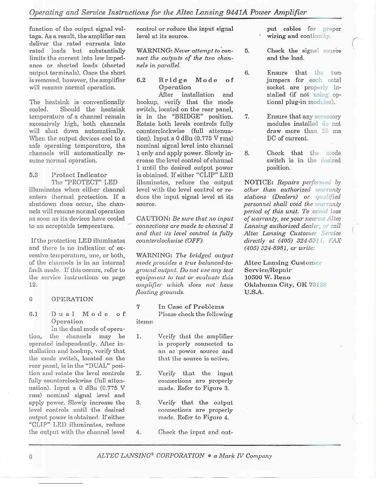 Altec Lansing 9441A - SERVICE INFORMATION; Equipment Needed; Adjusting VR02 and VR102, the BIAS Trimpot; Ordering Replacement Parts
