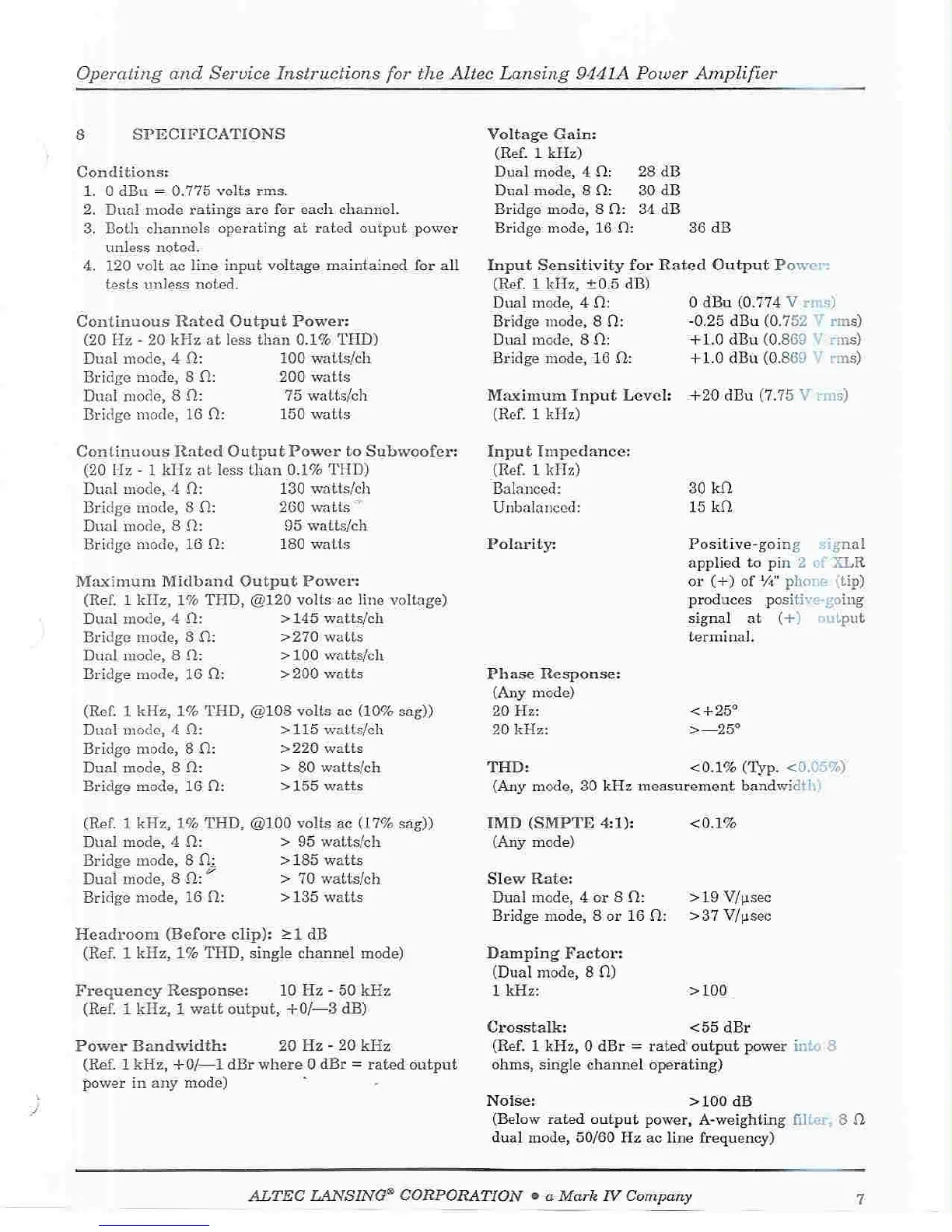 Altec Lansing 9441A - Voltage Gain; Input Sensitivity for Rated Output Power; Maximum Input Level; Input Impedance