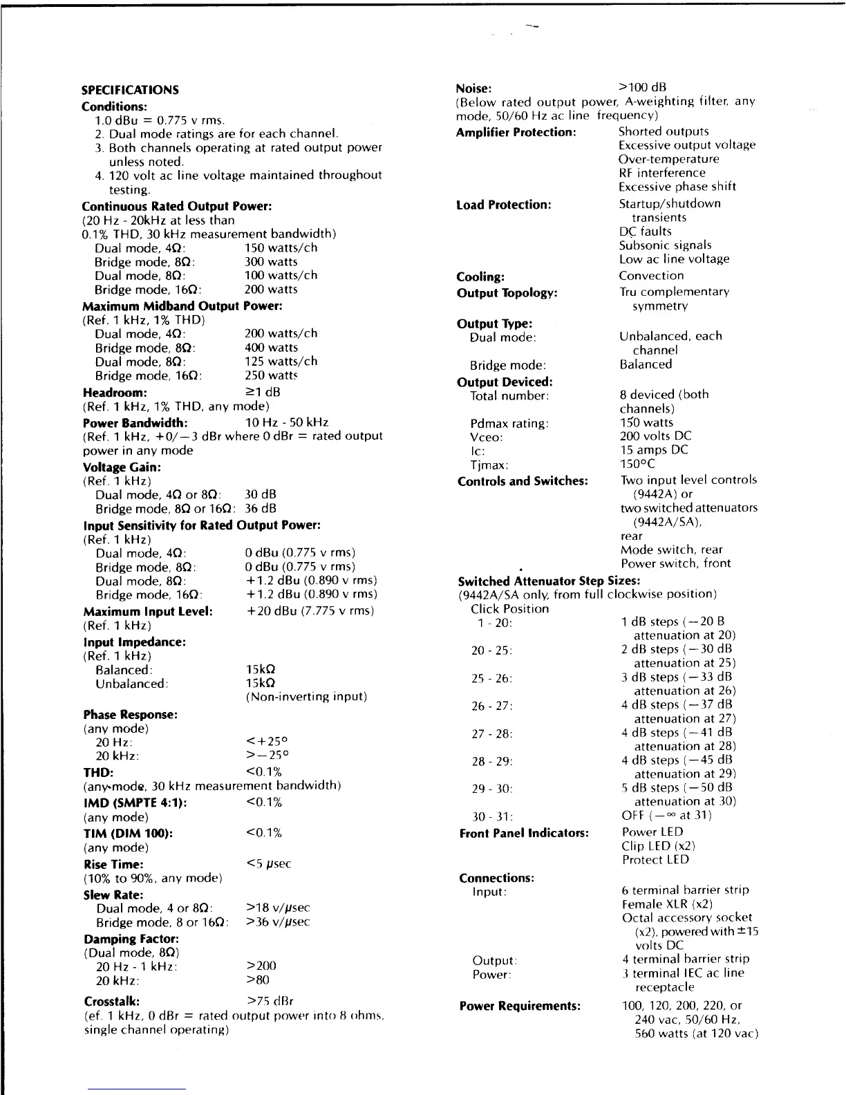 Altec Lansing 9442A - SPECIFICATIONS; Continuous Rated Output Power; Amplifier Protection; Load Protection