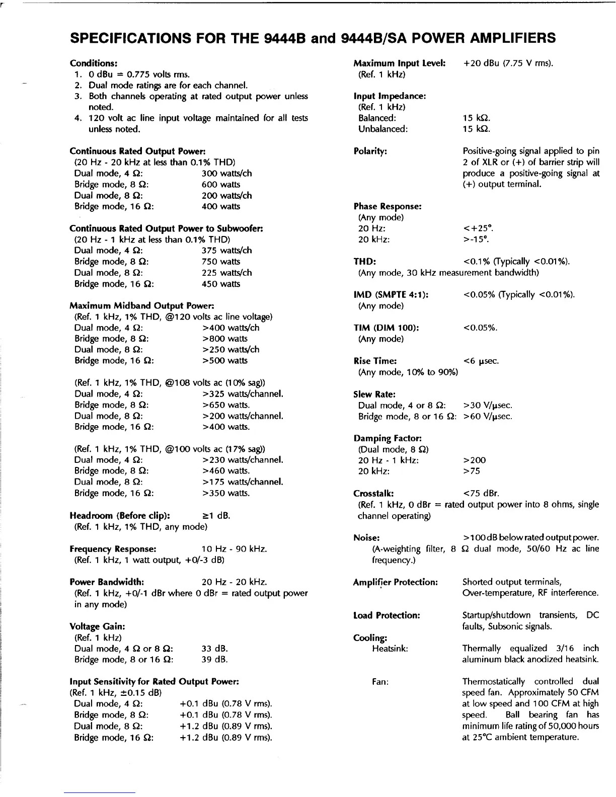 Altec Lansing 9444B POWER AMPLIFIER - Technical Specifications; Output Power and Performance; Input and Signal Characteristics; Reliability and Protection Features