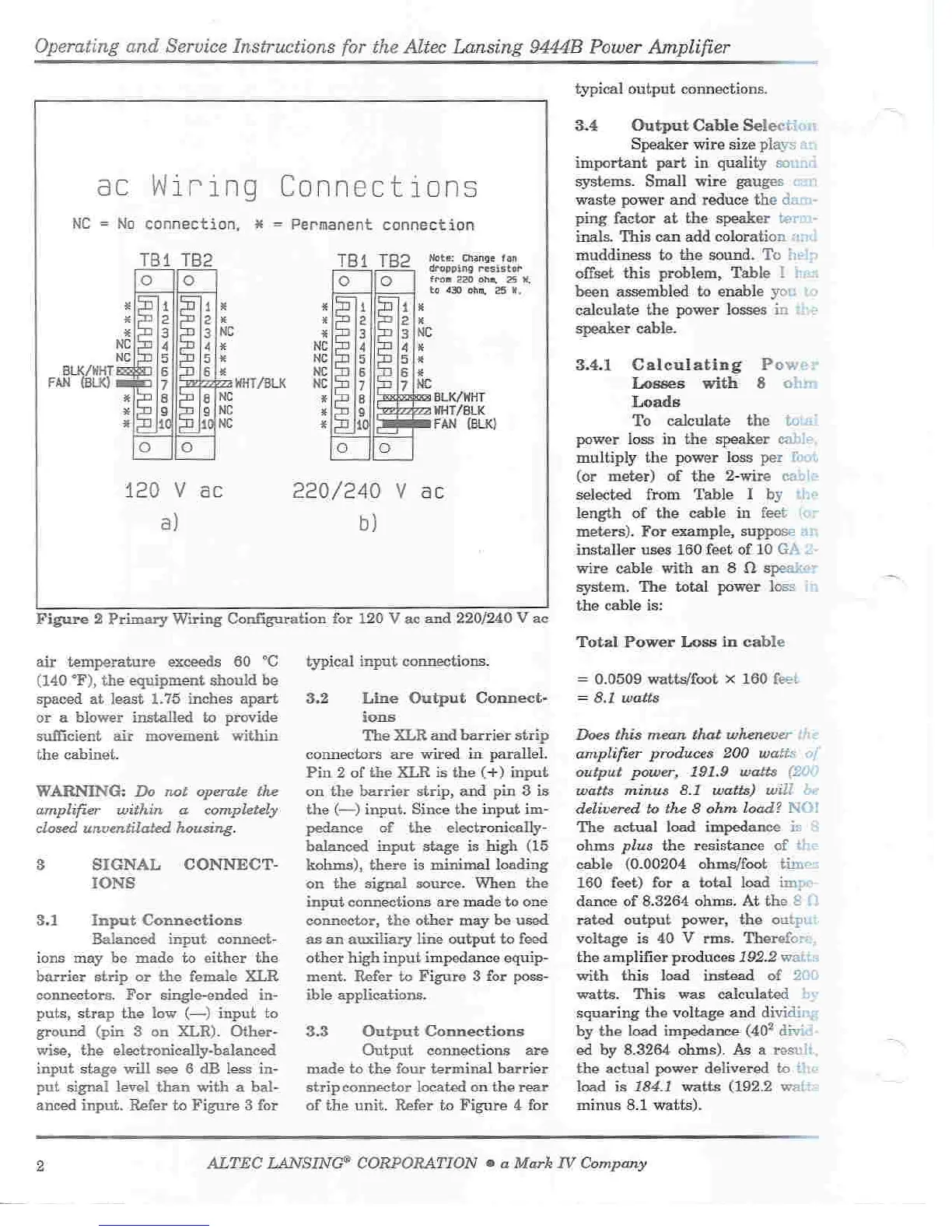 Altec Lansing 9444B - Signal Connections; Input Connections; Line Output Connections; Output Connections