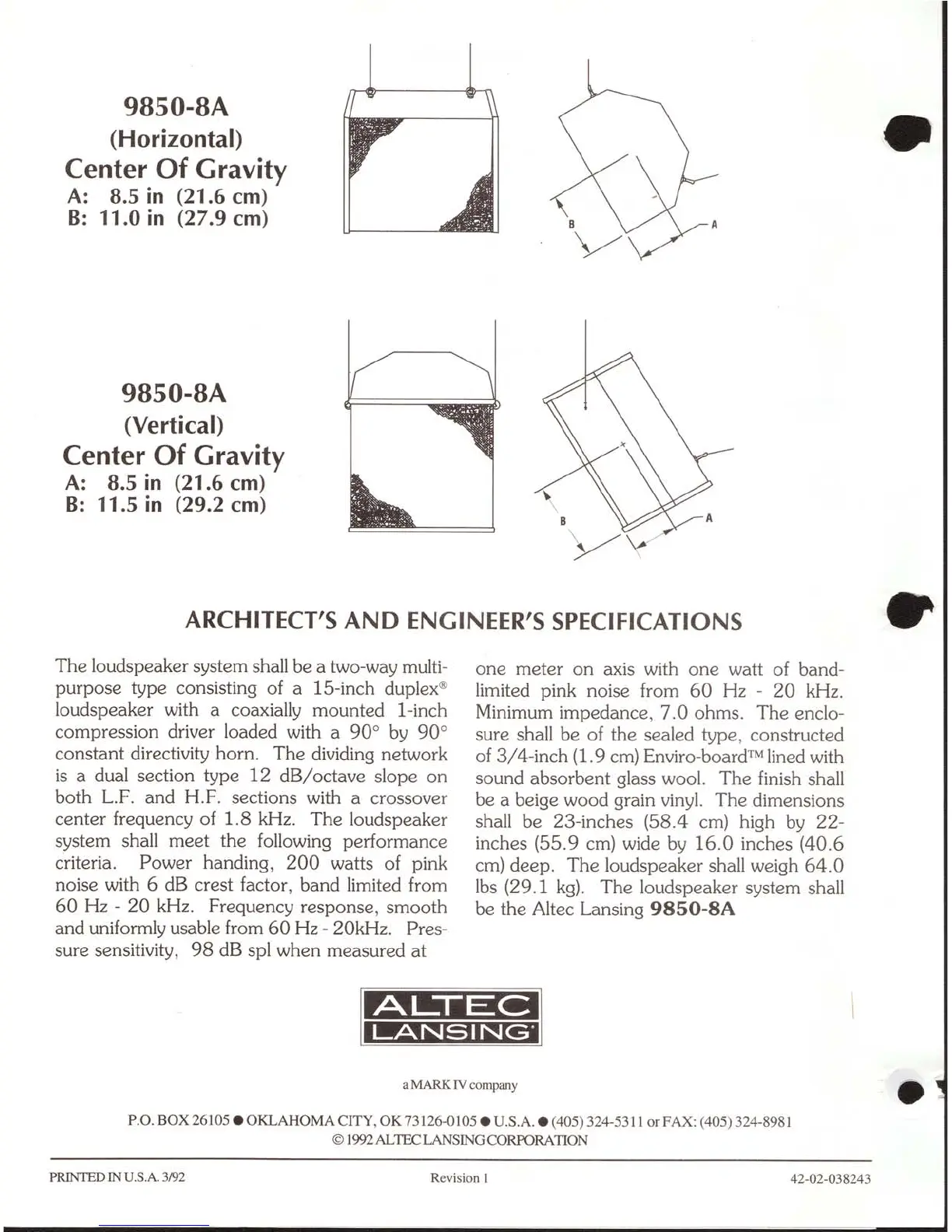 Altec Lansing 9850-8A SPEAKER SYSTEM - Architects and Engineers Specifications