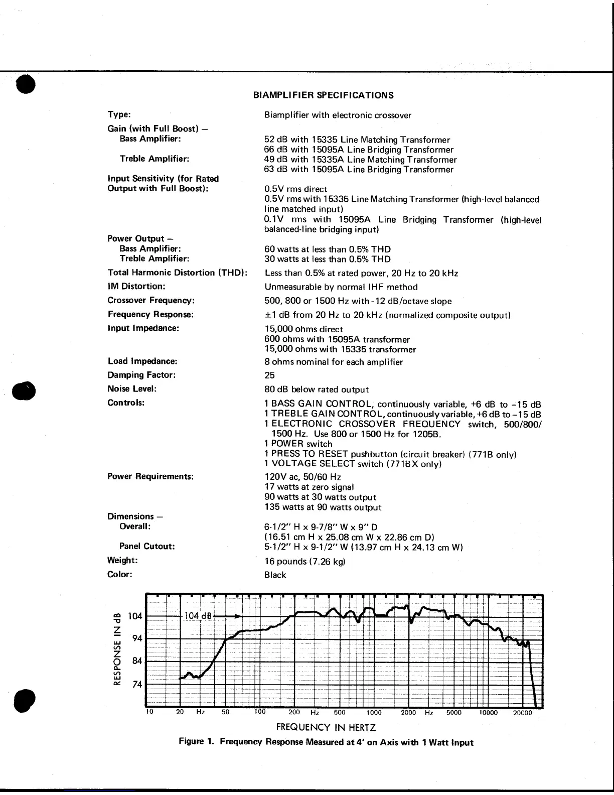 Altec 1205B SPEAKER SYSTEM - ALTEC 1205 B Biamplifier Specifications; Biamplifier Type and Gain; Input Sensitivity and Power Output; Performance Criteria: Distortion and Frequency