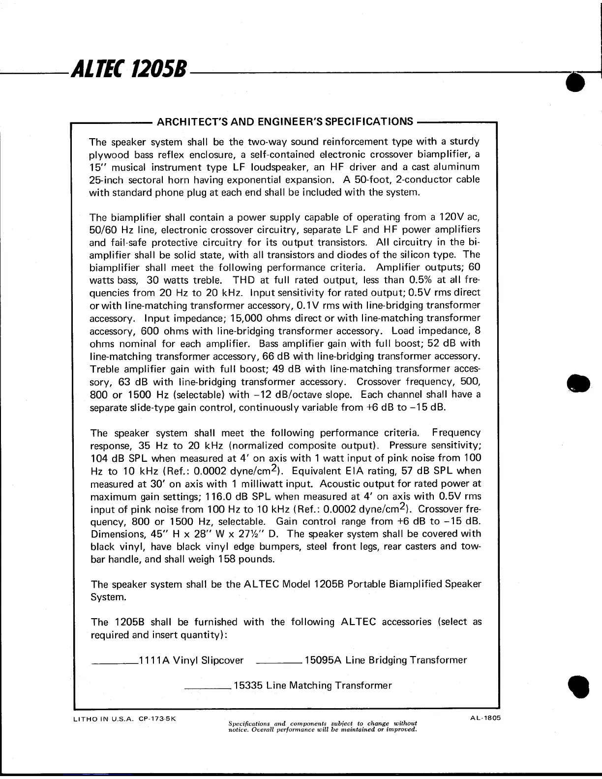 Altec 1205B SPEAKER SYSTEM - Architect and Engineer Specifications; System Construction and Components; Biamplifier Performance Criteria; Speaker System Performance Criteria