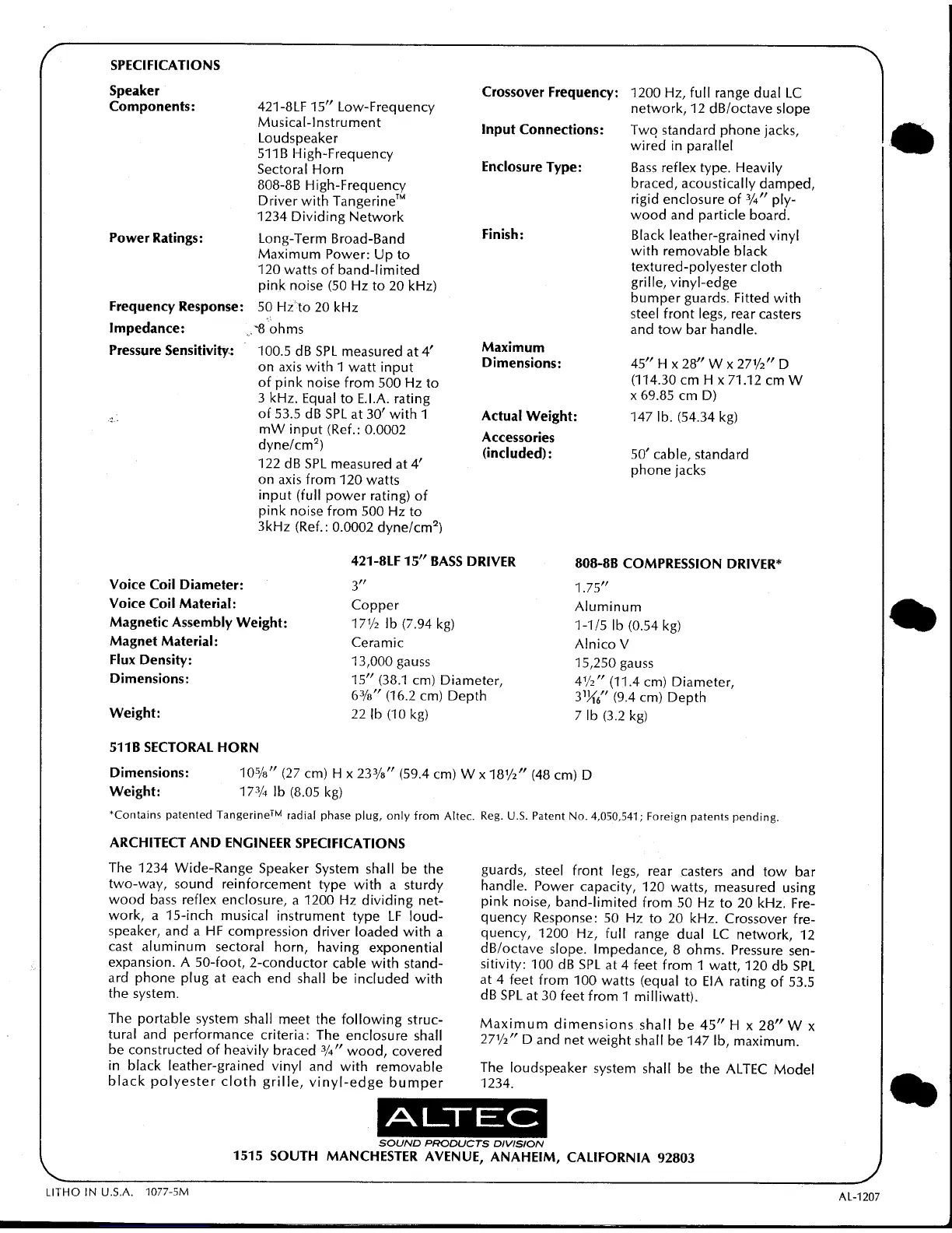 Altec 1234 - SPECIFICATIONS; Speaker Components; Power Ratings; Performance Metrics