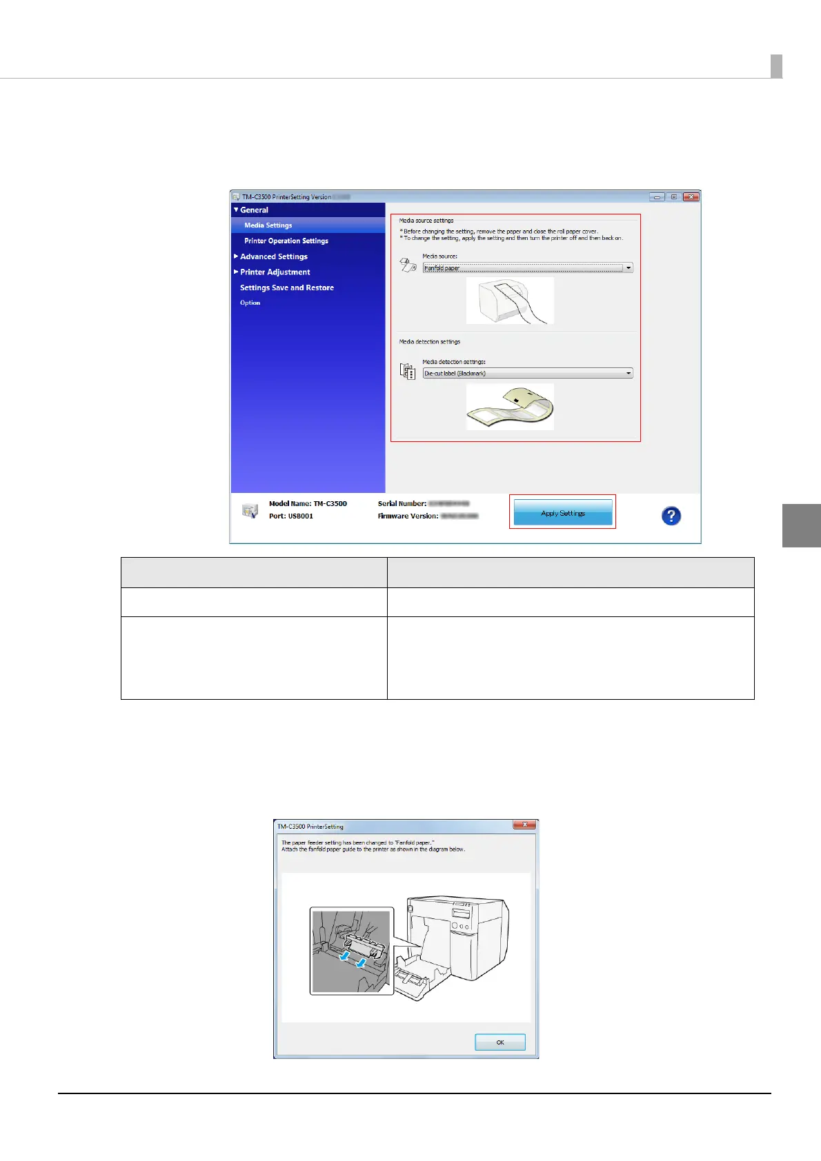 From TM-C3500 PrinterSetting, specify the media source and the media
