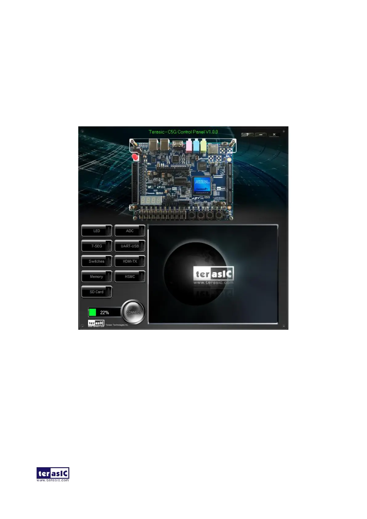 6. In case of a disconnect, click on CONNECT where the .sof will be re-loaded onto the