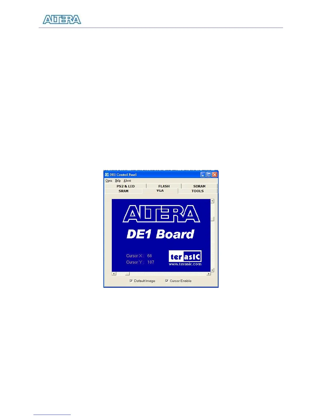 • Connect a VGA monitor to the DE1 board and you should see on the screen the default