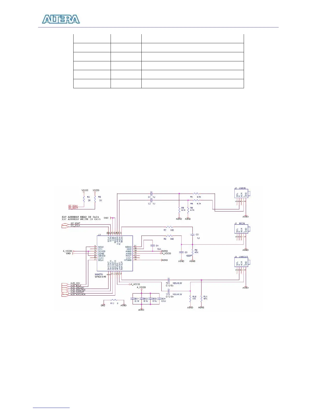 which is connected to pins on the Cyclone II FPGA. A schematic diagram of the audio circuitry is