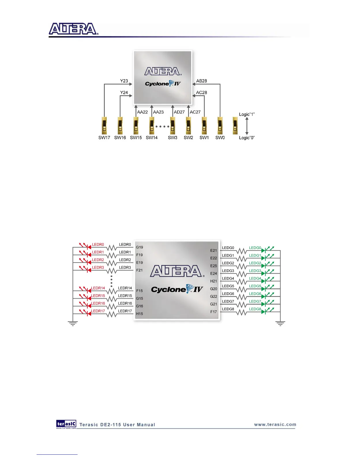 the pin low turns it off. Figure 4-9 shows the connections between LEDs and Cyclone IV E FPGA.