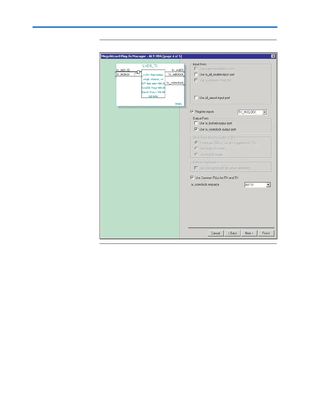 Figure 5–43. Page 4 of the Transmitter altlvds MegaWizard Plug-In Manager