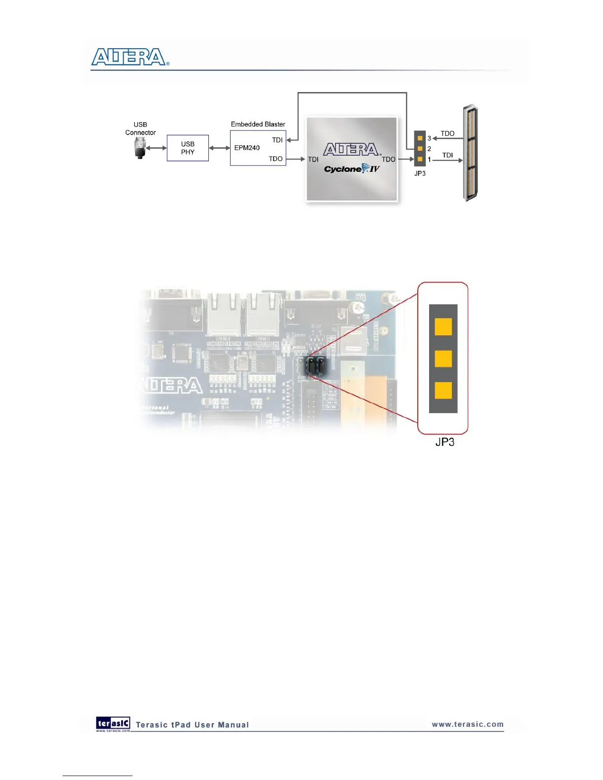 Connect the supplied USB cable to the USB-Blaster port on the tPad board