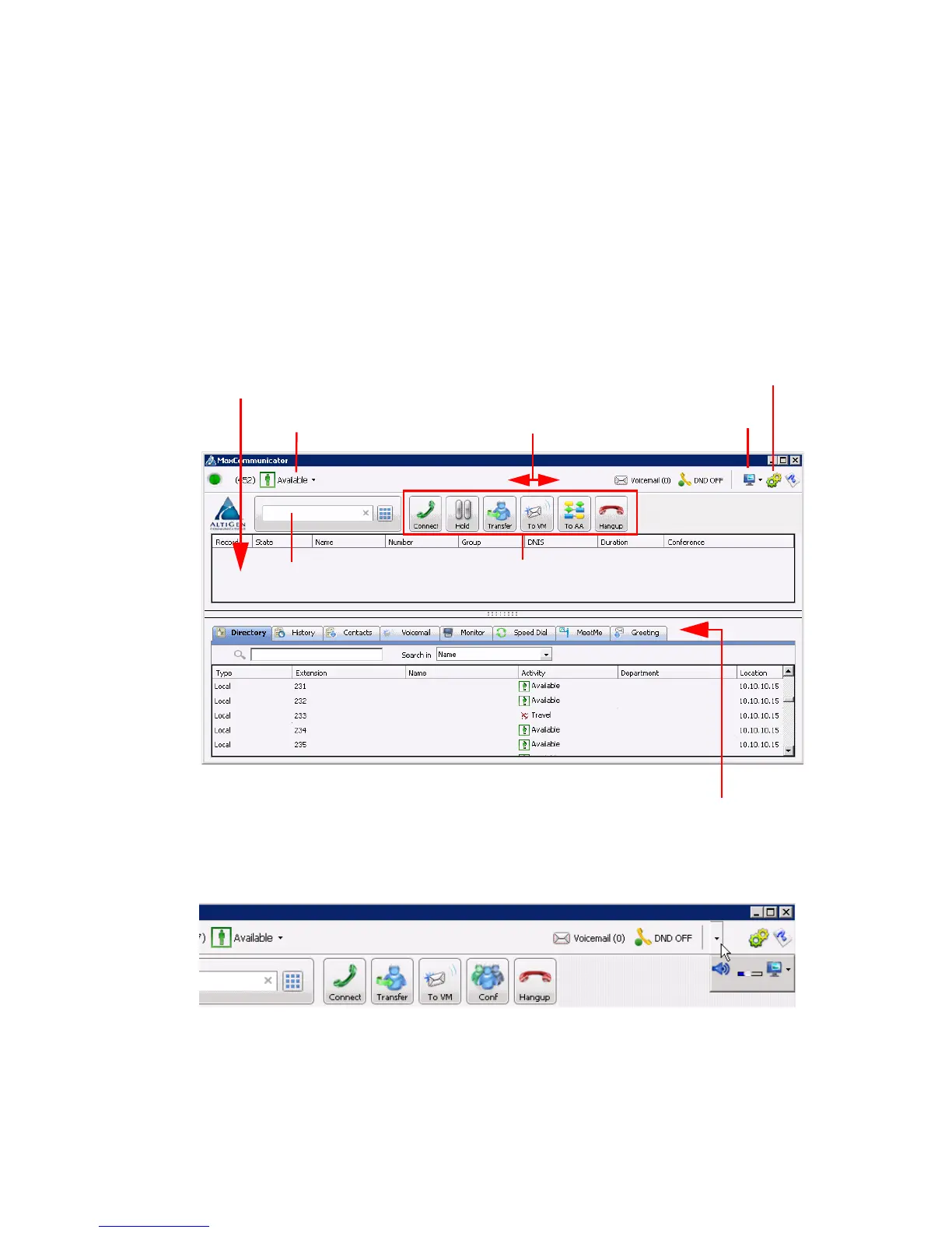 Once you log in to MaxCommunicator, the main window appears, providing
