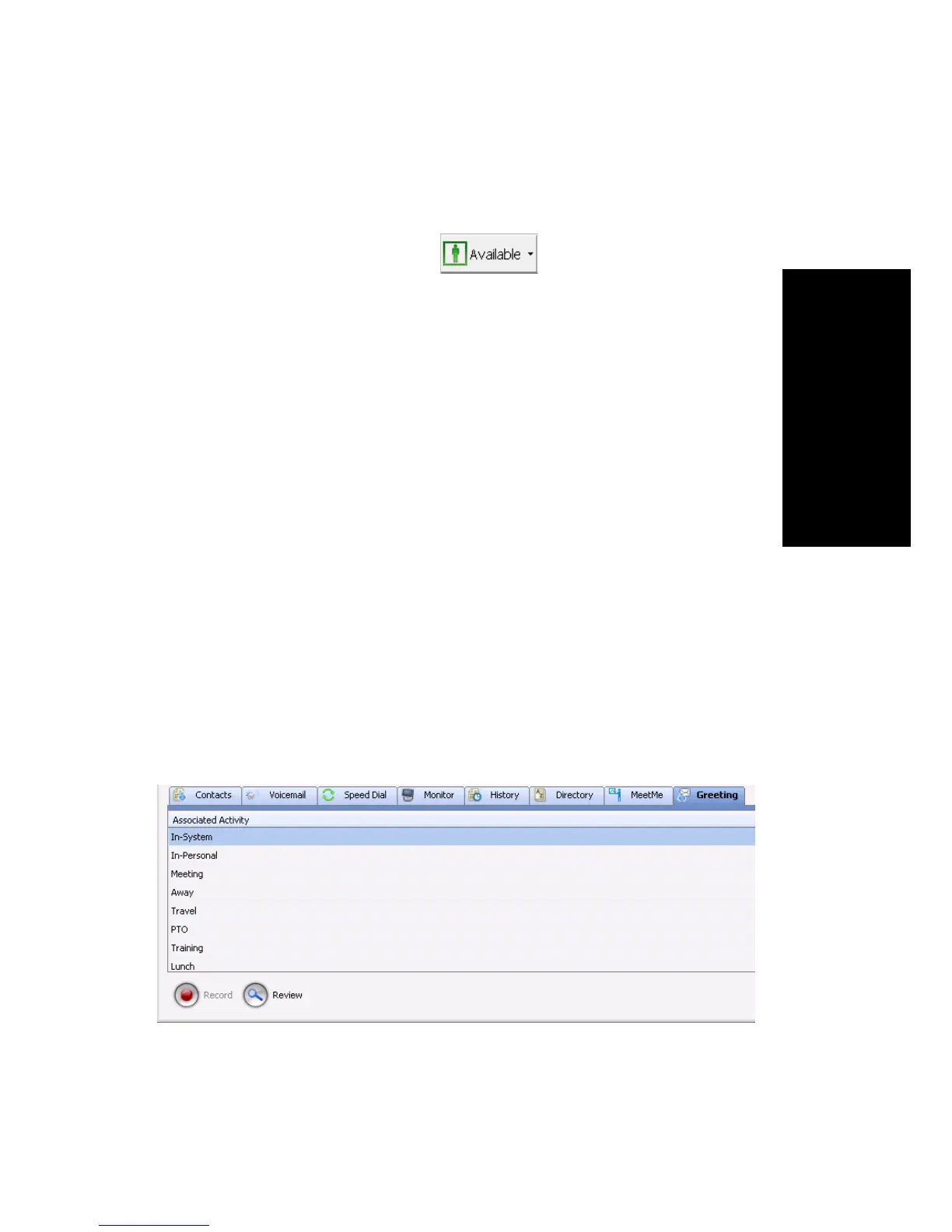 You can record a different greeting for each Activity status. To do so, click