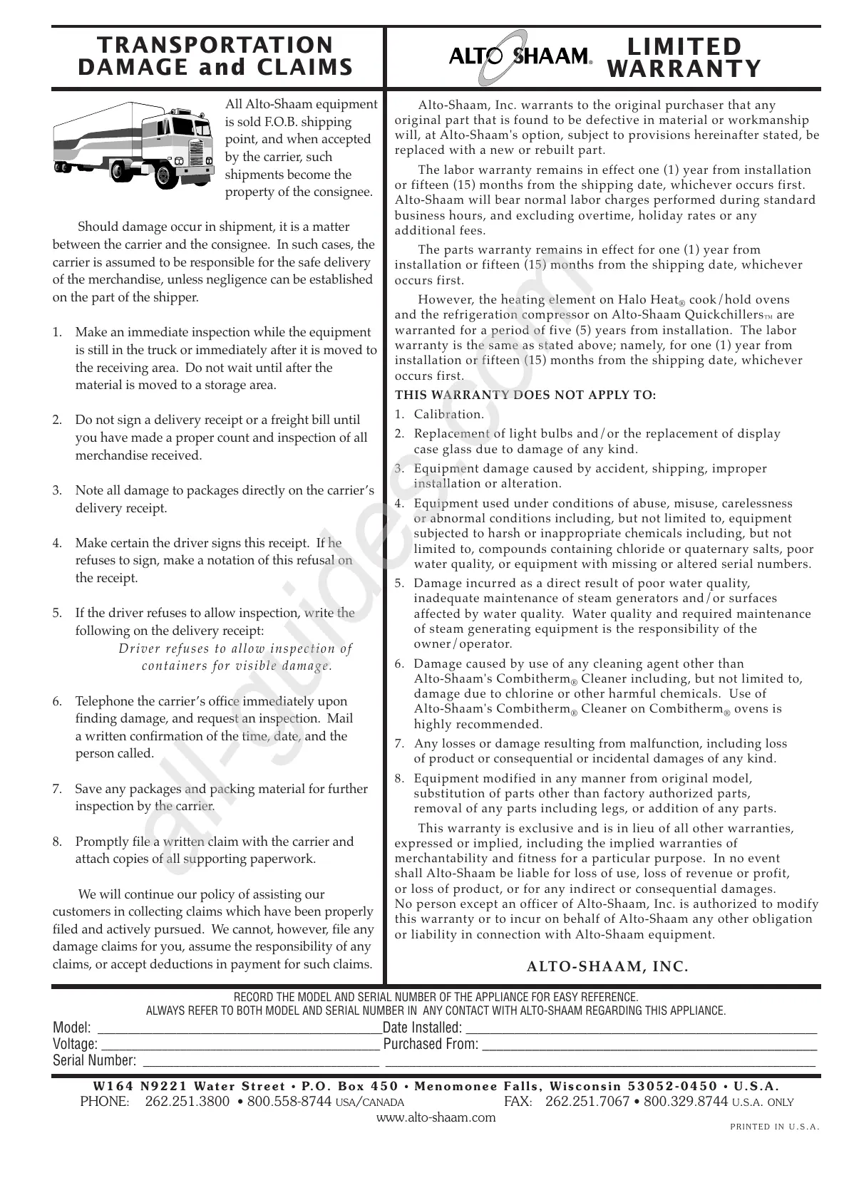 Alto-Shaam, Inc. warrants to the original purchaser that any