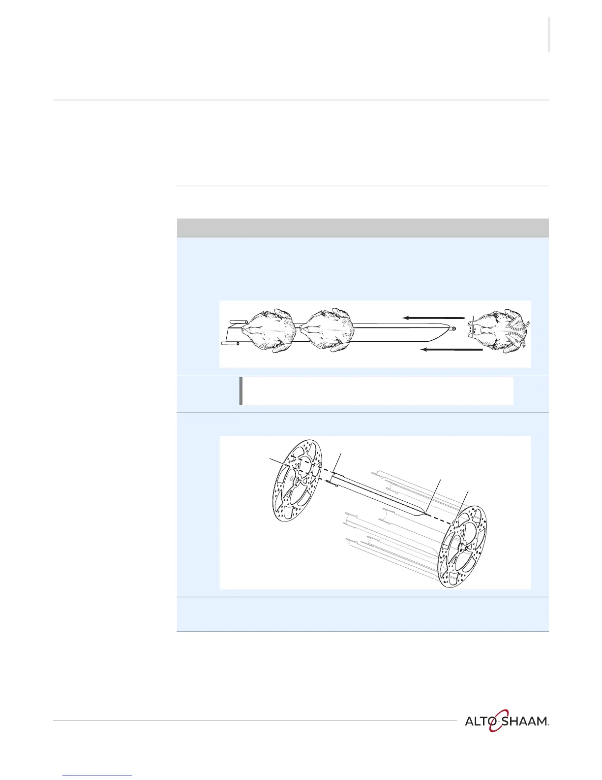 Load three (3) 3-1/2 lb (1,6 kg) chickens per spit for a maximum capacity of