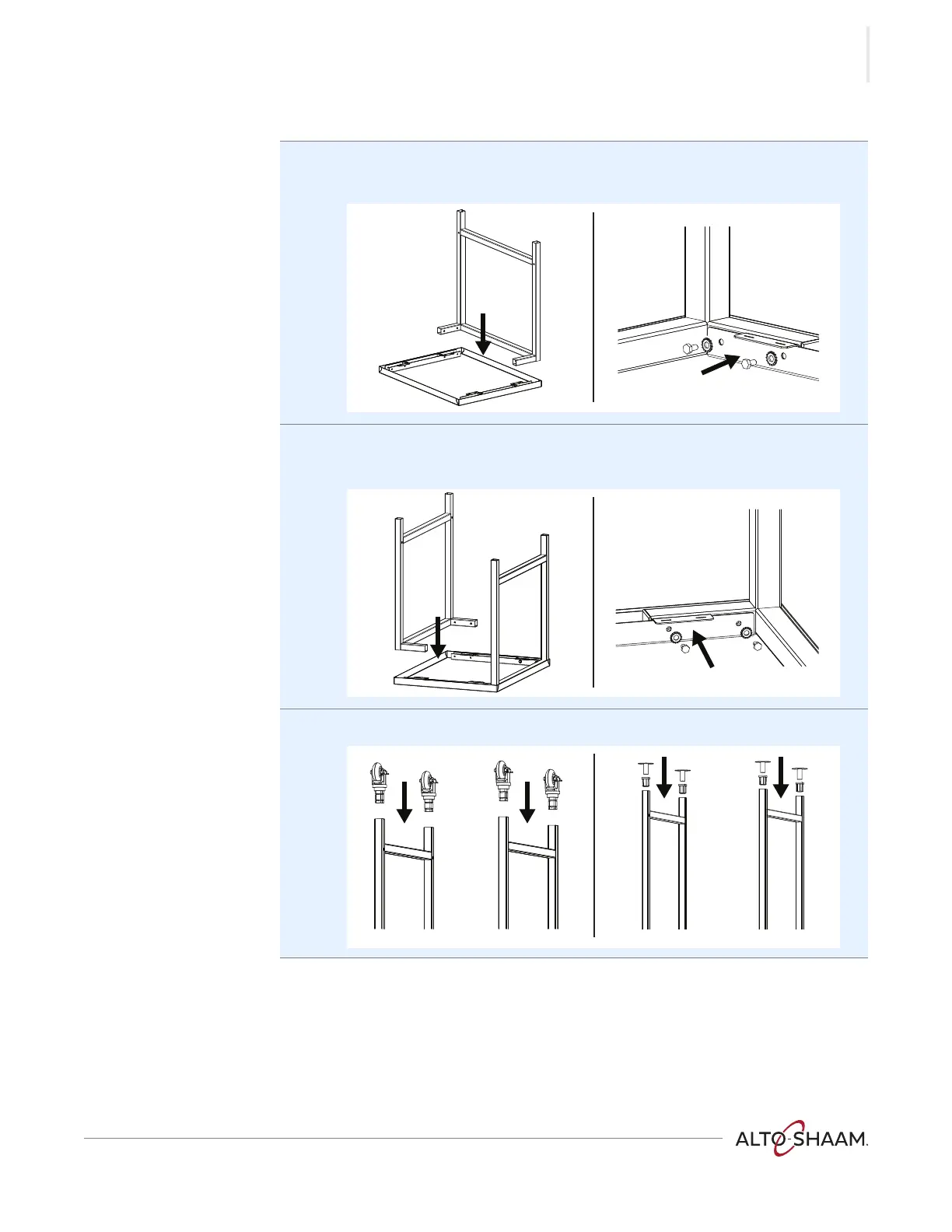 5. Install the casters or the feet assemblies into the legs.