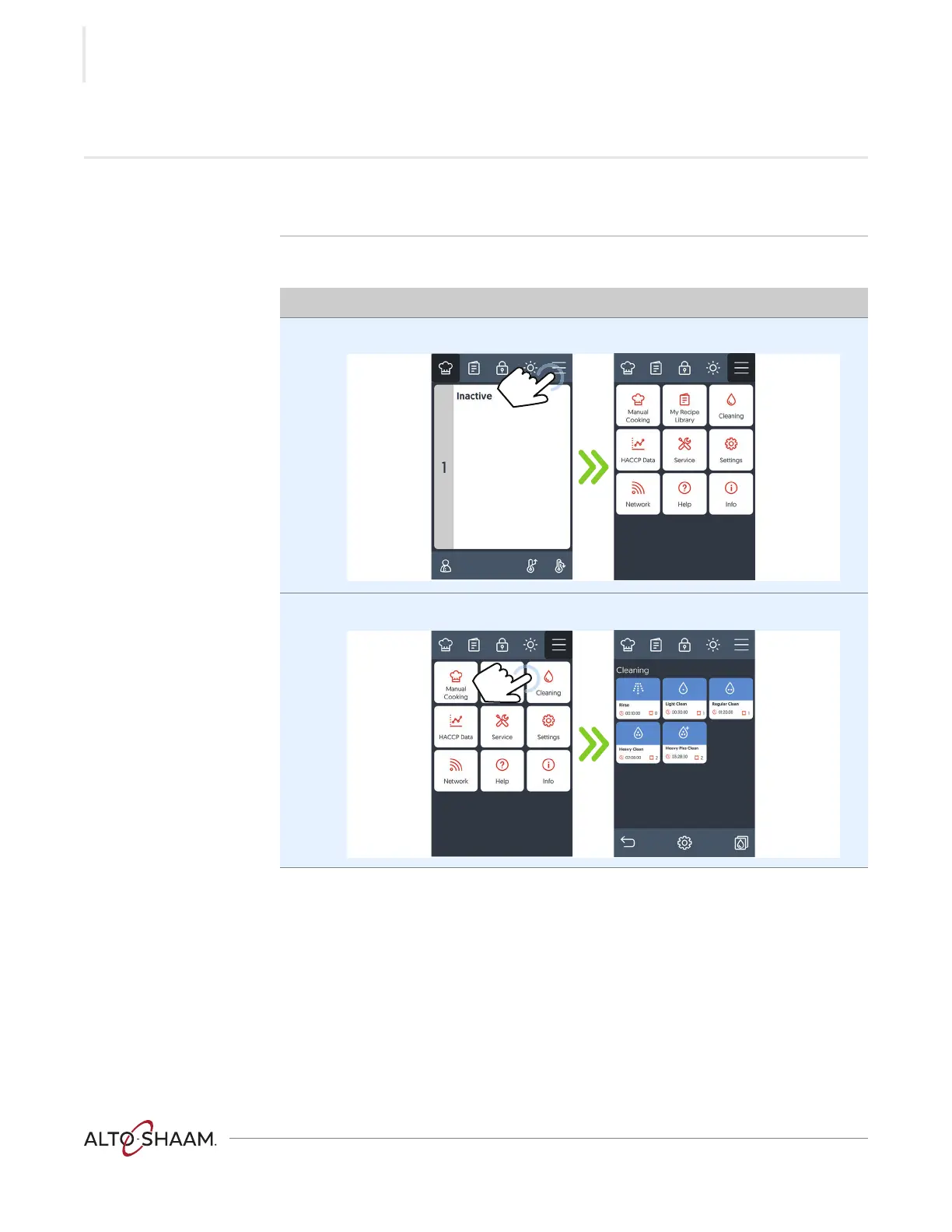2. Touch the “Cleaning” icon 0. The “Cleaning” screen displays.
