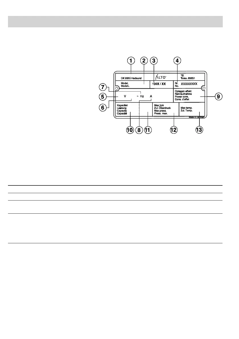 the text on the cabinet, ALTO 52C3KA as an example, and the model tag on the back of the machine (pos.