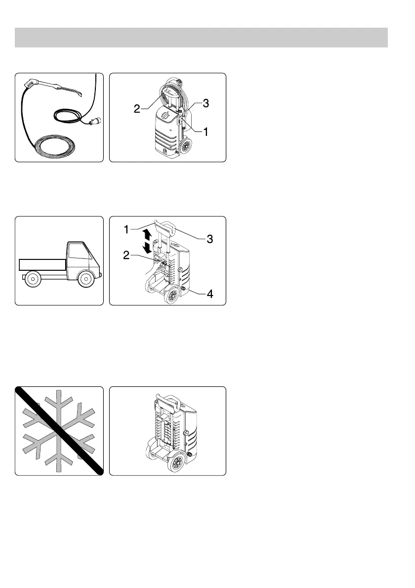 and place it on the transport handle (2). Then wind up the high pressure hose and place it on the electric