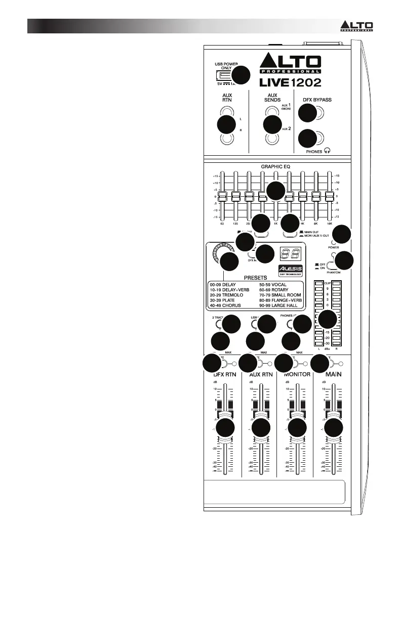channels' DFX Knobs. When the effects processor is muted, the LED will be solidly lit.