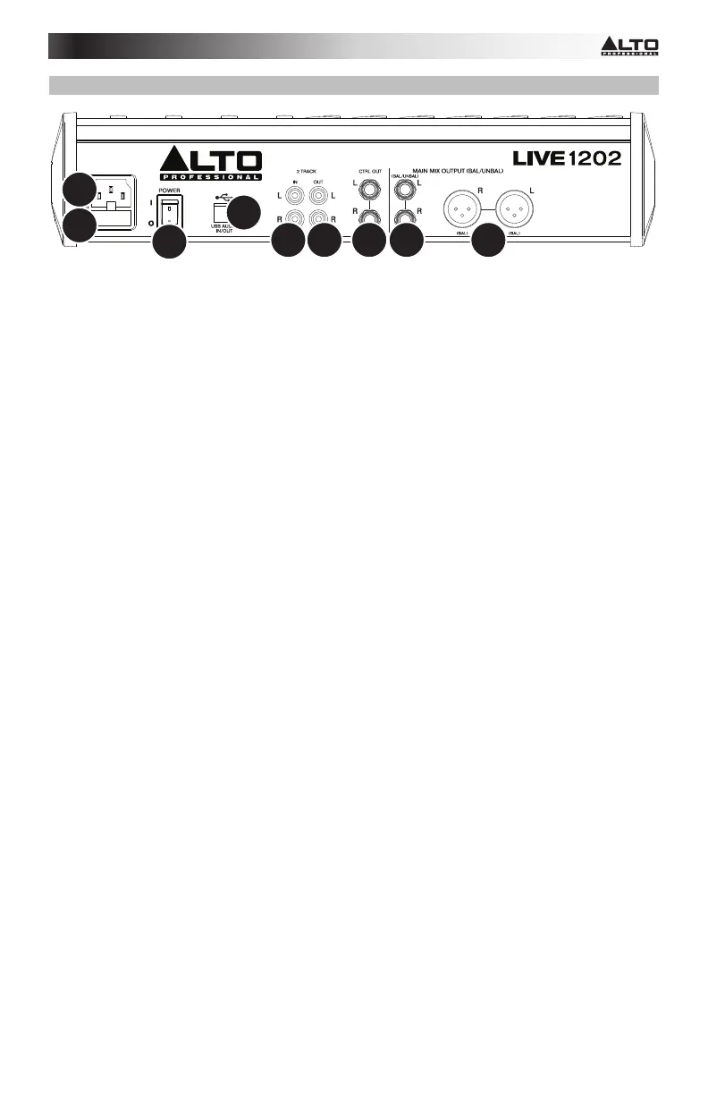 1. Power In: Use the included power cable to connect the mixer to a power outlet. While