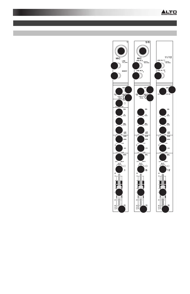11. Perilla de monitor: Ajusta el nivel de pre-fader de la señal enviada desde ese canal a la mezcla