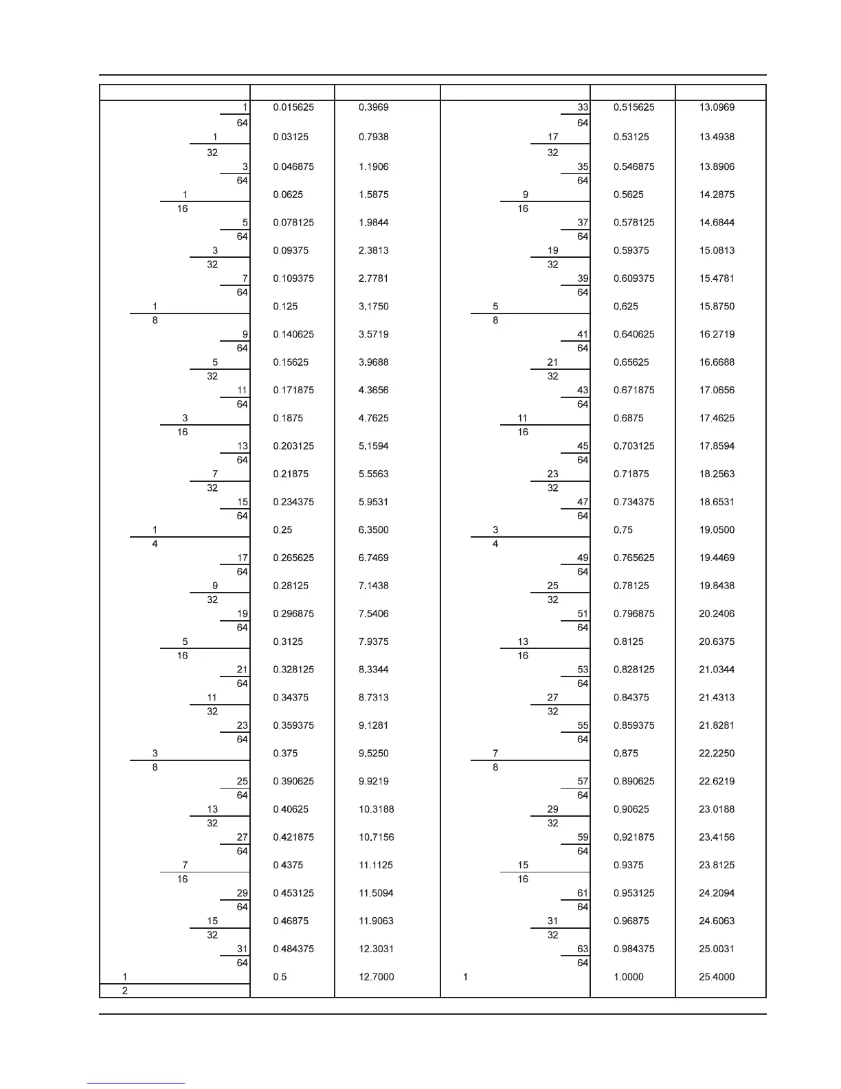 DECIMAL METRIC CONVERSION TABLE