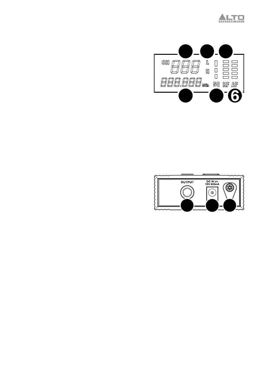 6. AF: Este medidor muestra el nivel de la señal de audio actual que se recibe desde el transmisor.