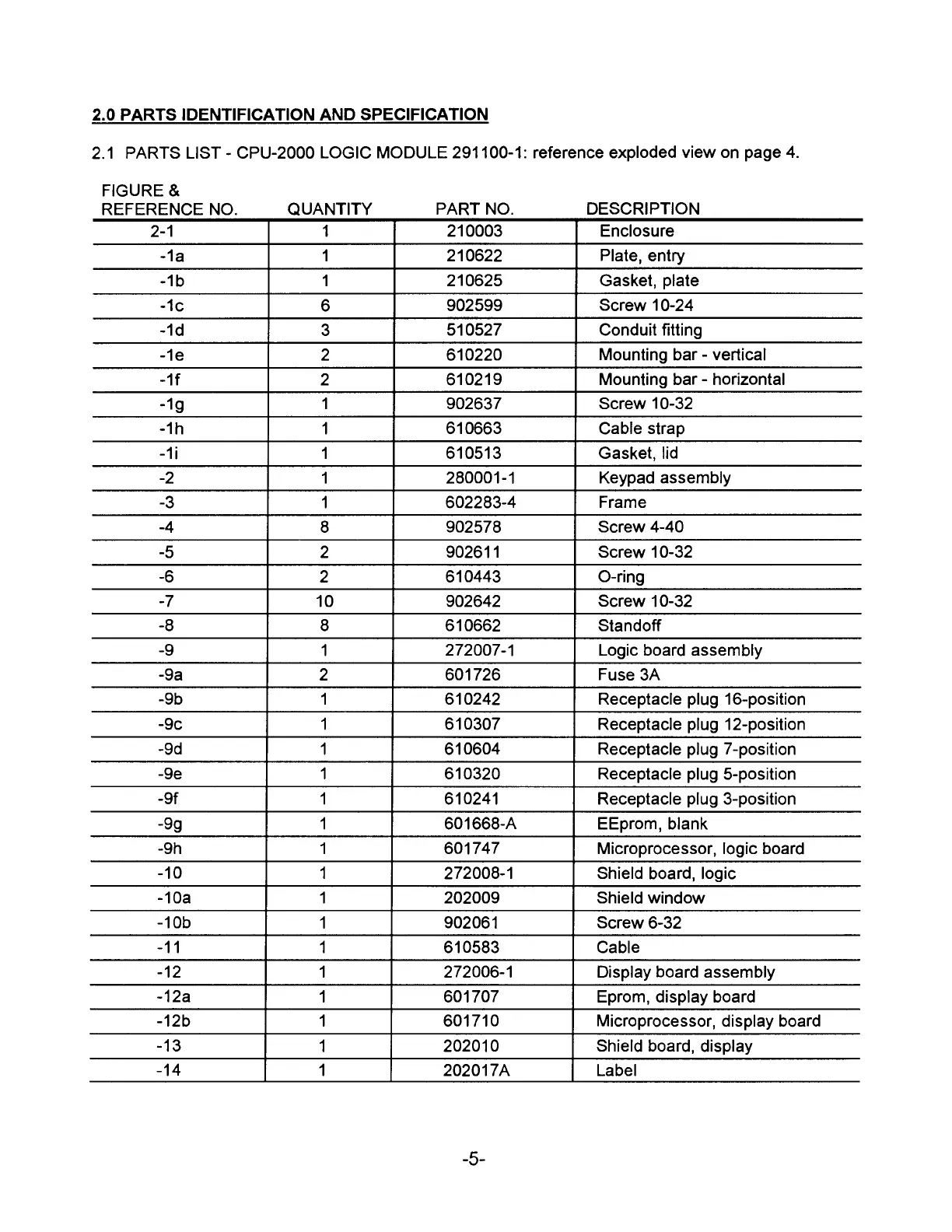 PARTS LIST - CPU-2000 LOGIC MODULE 291100-1: reference exploded