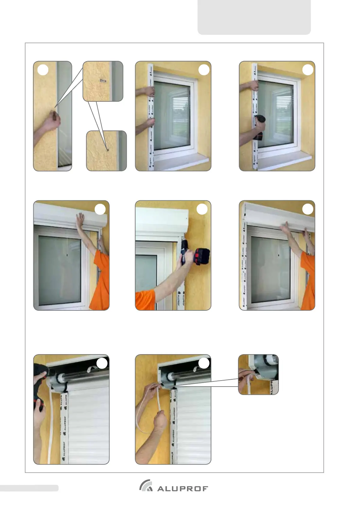 f) Lower the roller shutter’s curtain to the windowsill and screw the shutter box to the basis (on either side) [108].
