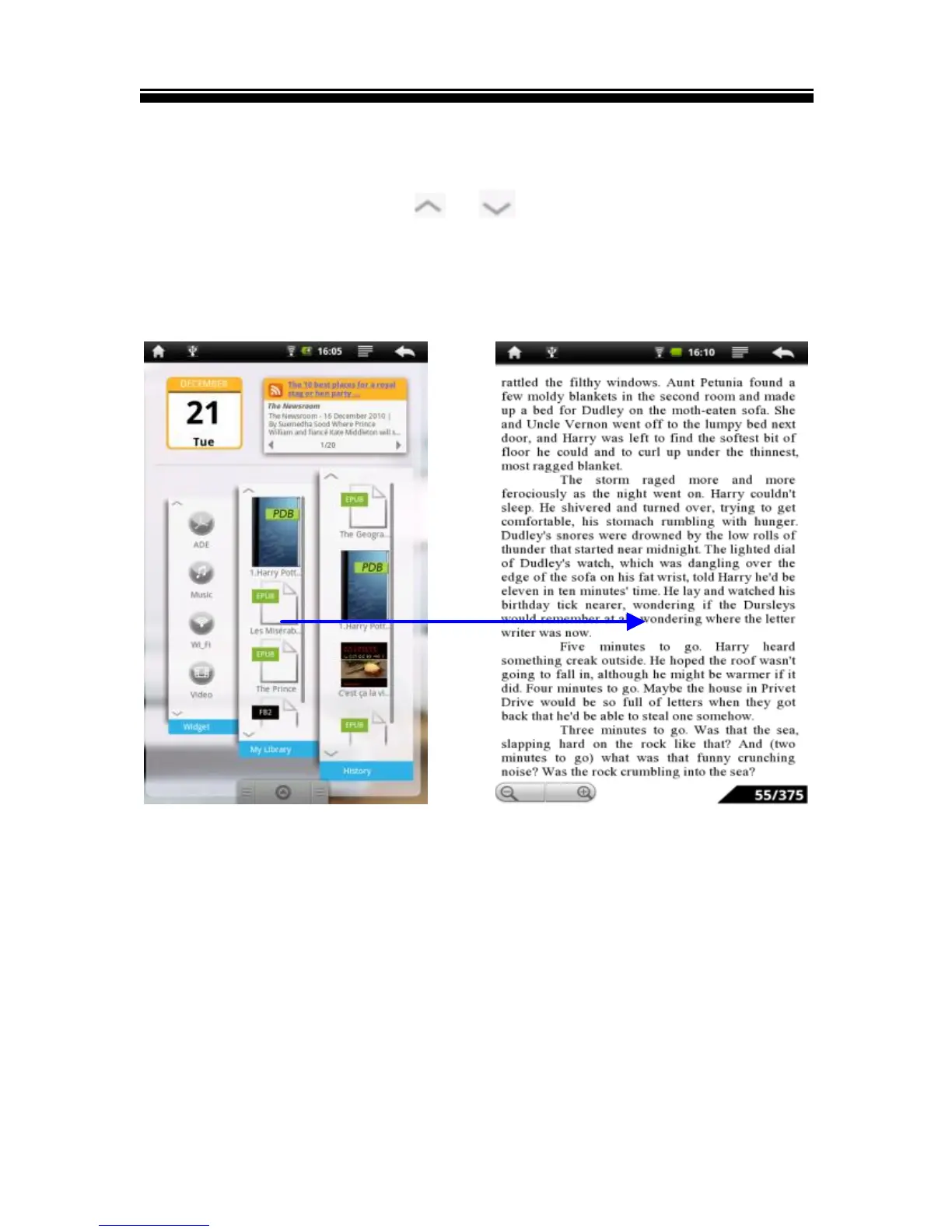 Tap History to view your recently read e-book, tap My Library