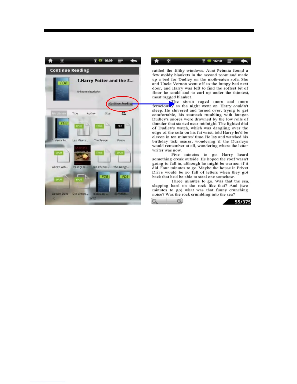 Tap Continue Reading to read e-books: