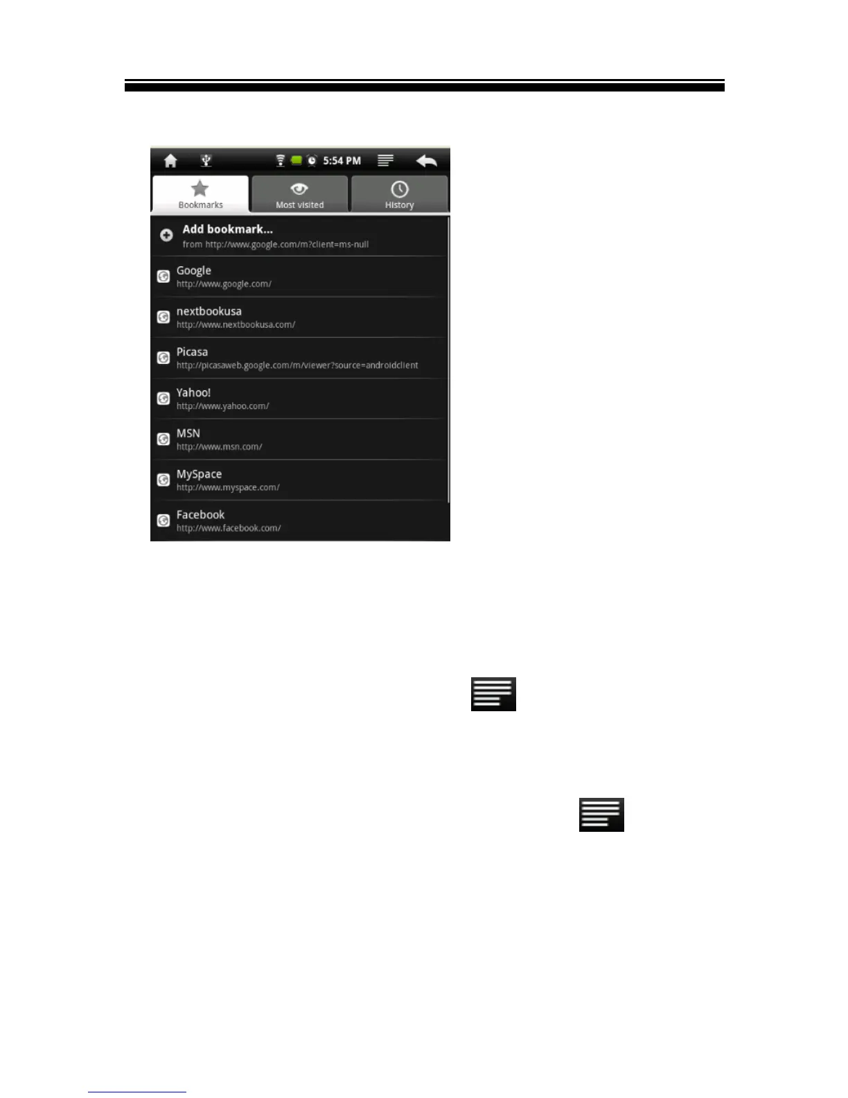 bookmarks. Tap the Menu button to take last visited