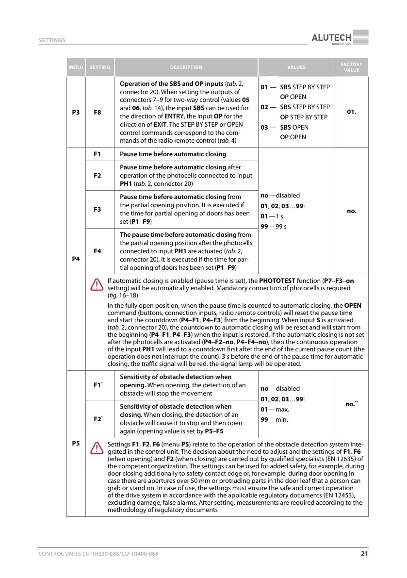 Settings F1, F2, F6 (menu P5) relate to the operation of the obstacle detection system inte-
