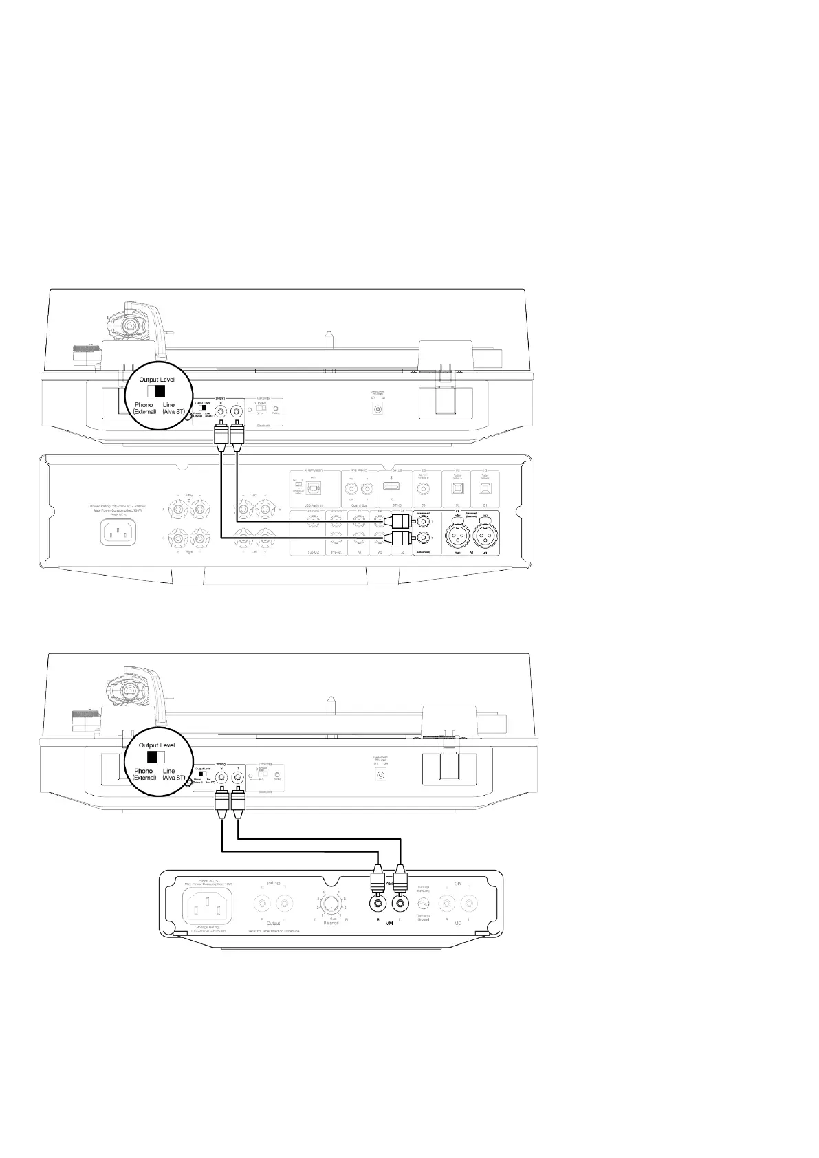 Important note: Before making a connection, set the Output Level switch to 'Line (Alva TT/ST)'. Do not connect to an external phono stage.