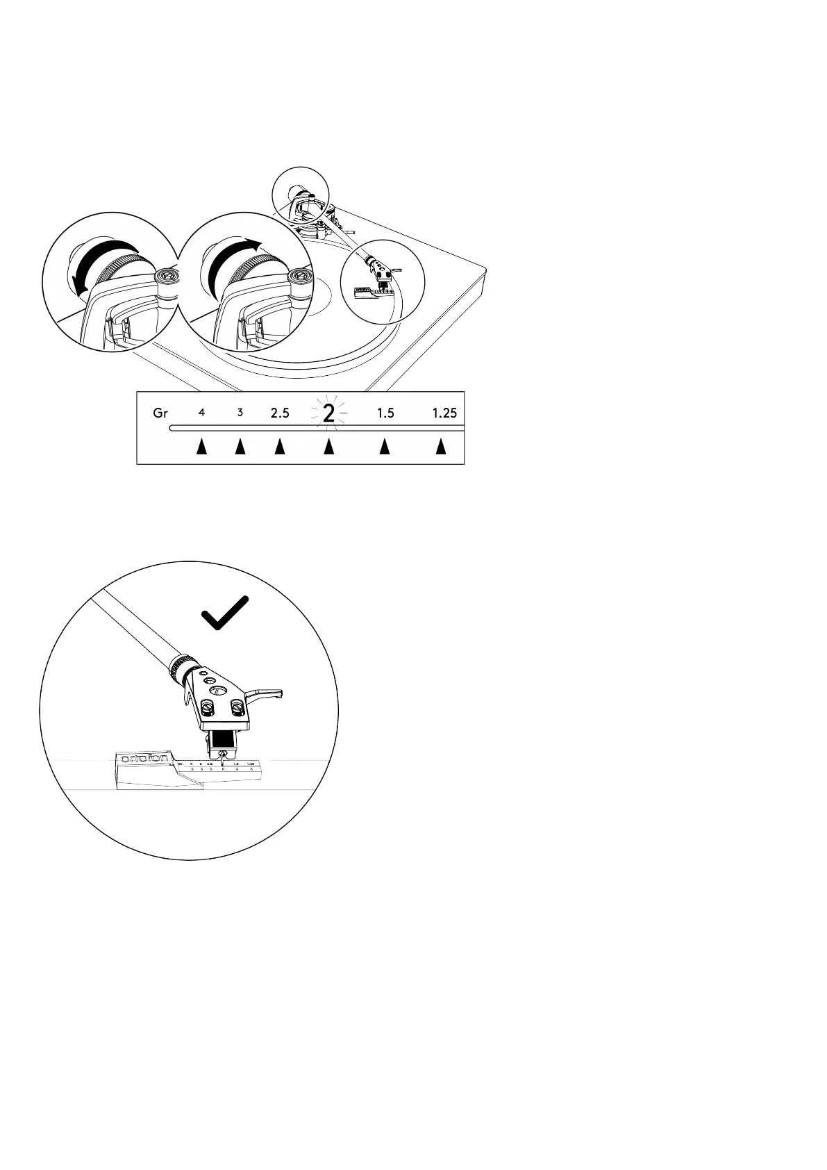 Adjust the counterweight until the stylus force gauge is in balance. Once the stylus is in balance, return the tonearm to its armrest. The anti-skate