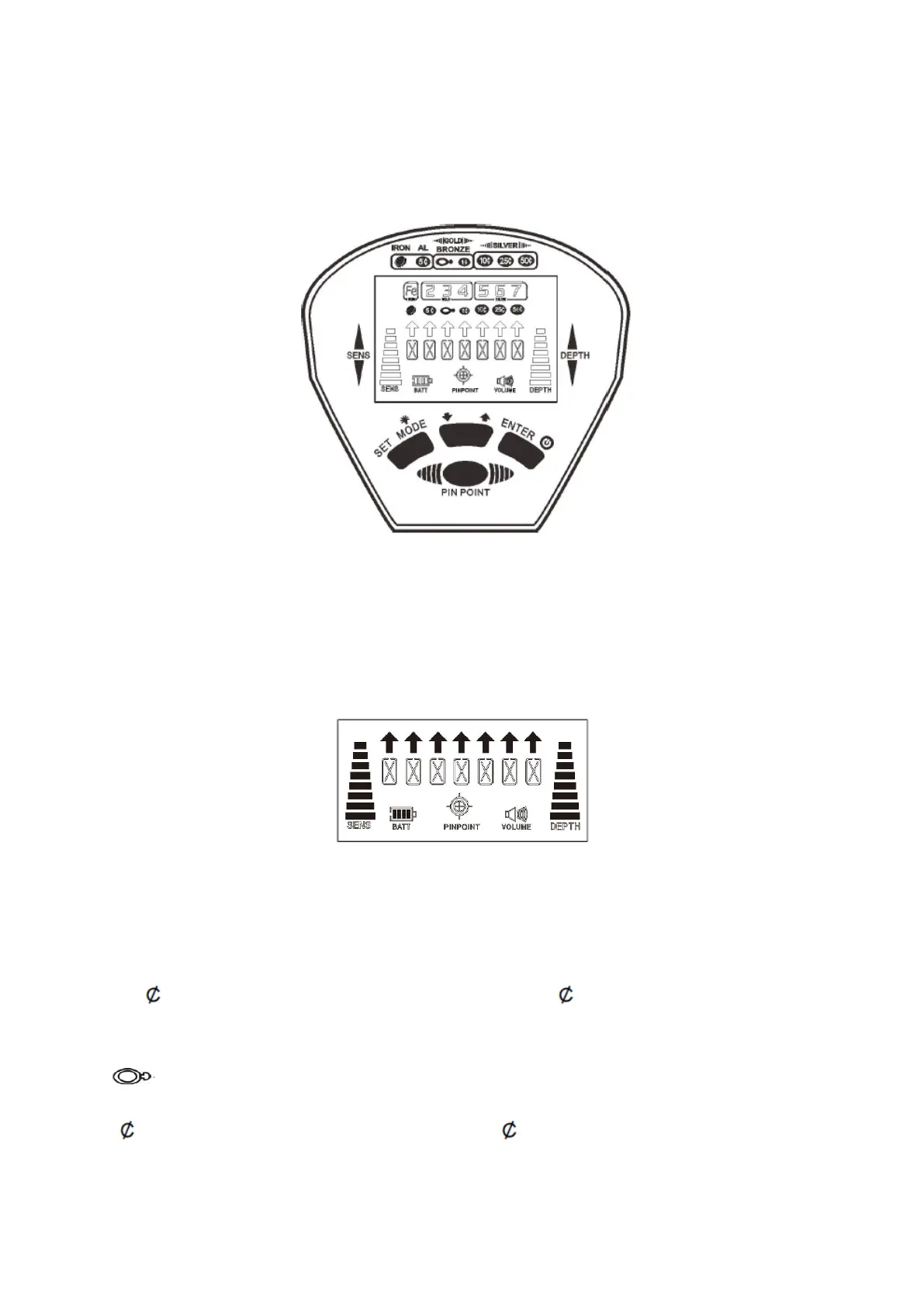 When the detector finds an object, an arrow appears below the target icon. Also displays