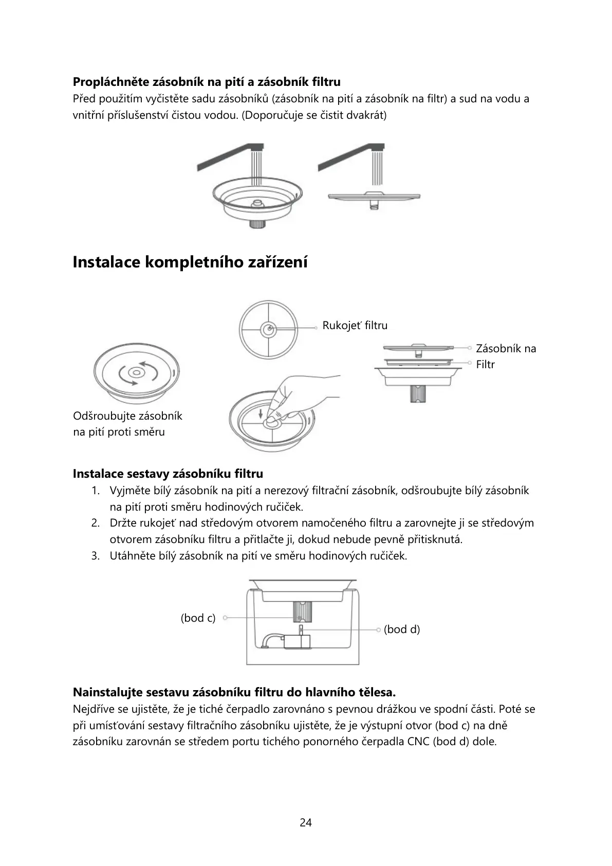 Před použitím vyčistěte sadu zásobníků (zásobník na pití a zásobník na filtr) a sud na vodu a