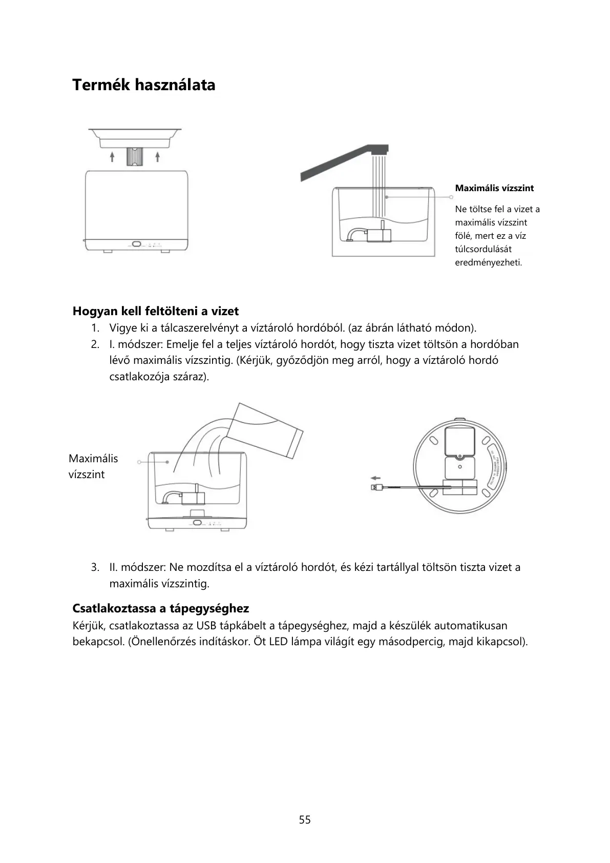 Kérjük, csatlakoztassa az USB tápkábelt a tápegységhez, majd a készülék automatikusan