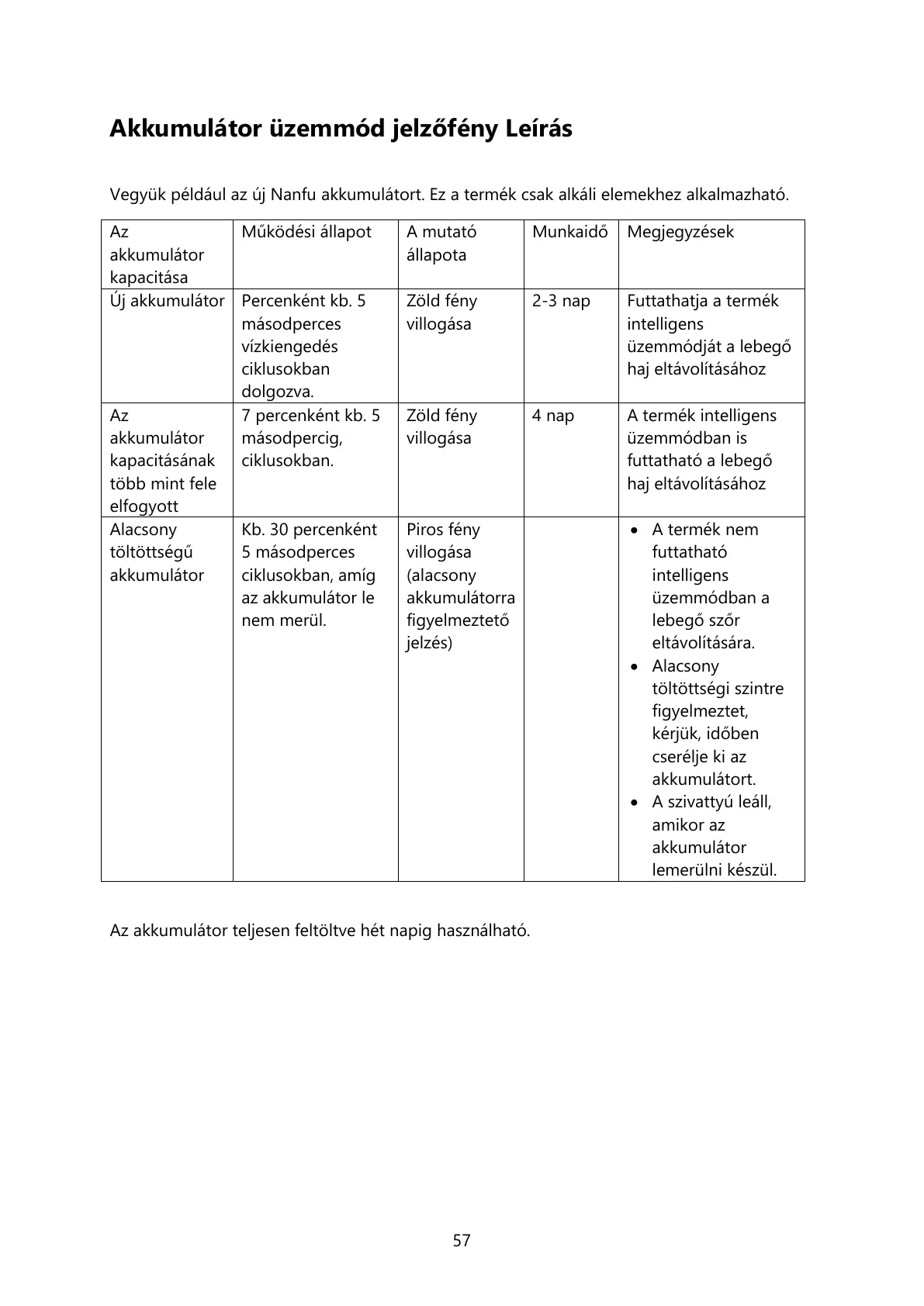 Az akkumulátor teljesen feltöltve hét napig használható.