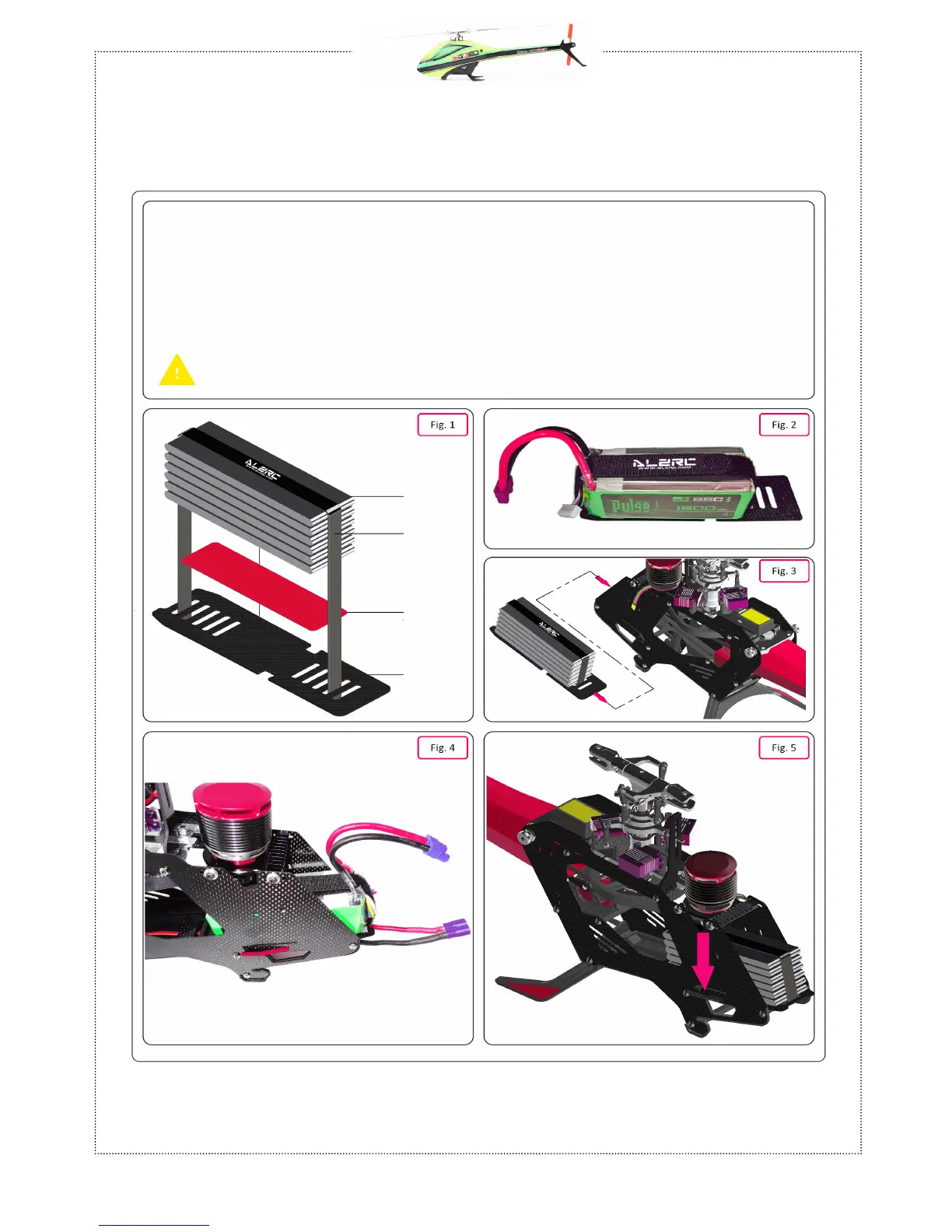 Install the battery to the battery tray using double sided tape and the long Velcro straps included (Fig 1 and Fig 2).
