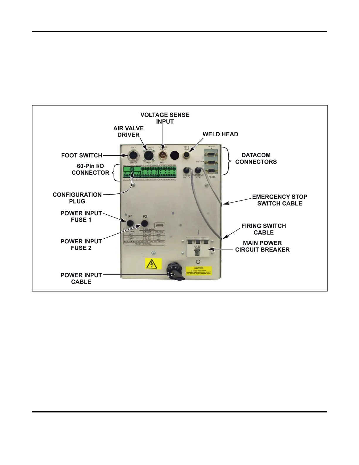 • The weld cable connections from the weld head are made at the weld cable terminals on the front