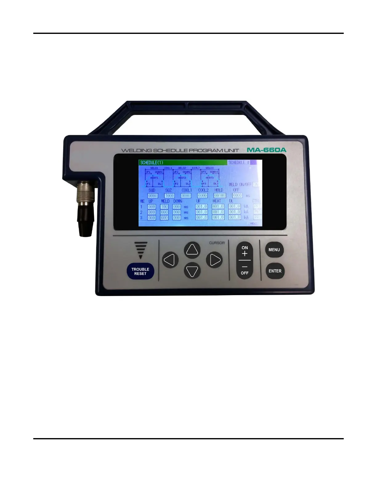 The Control uses the Pendant to set the weld schedules and see the monitored results. The pendant is