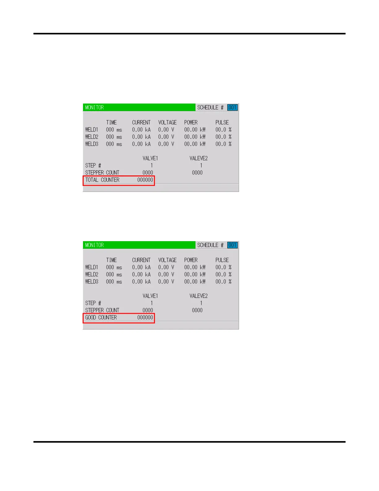 2. When WELD2 STOP/WELD COUNT is WELD2 STOP and COUNTER is GOOD.
