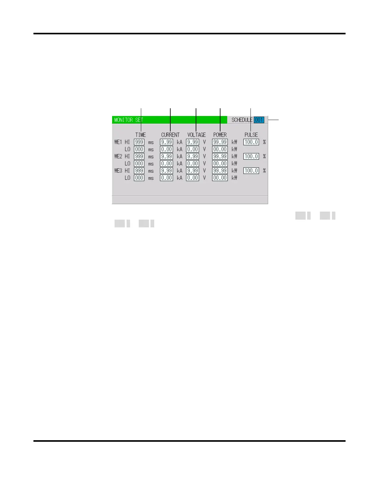 Set the upper limit (HI) and lower limit (LO) of the weld time for each of WE1, WE2 and WE3.