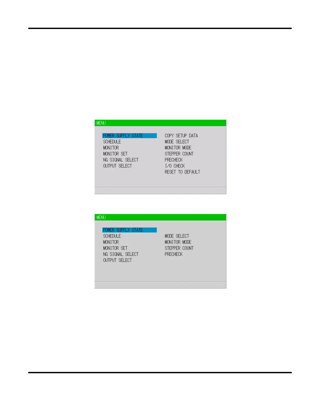 MENU screen changes. COPY SETUP DATA, I/O CHECK and RESET TO