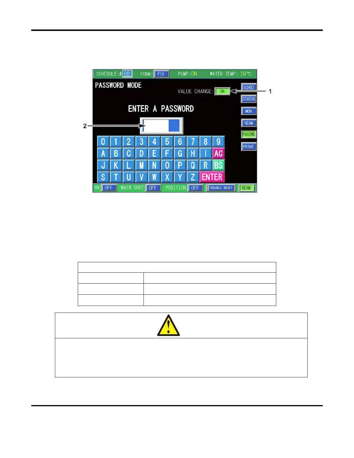 1. VALUE CHANGE – In order to change the Password, the VALUE CHANGE field must be ON. In