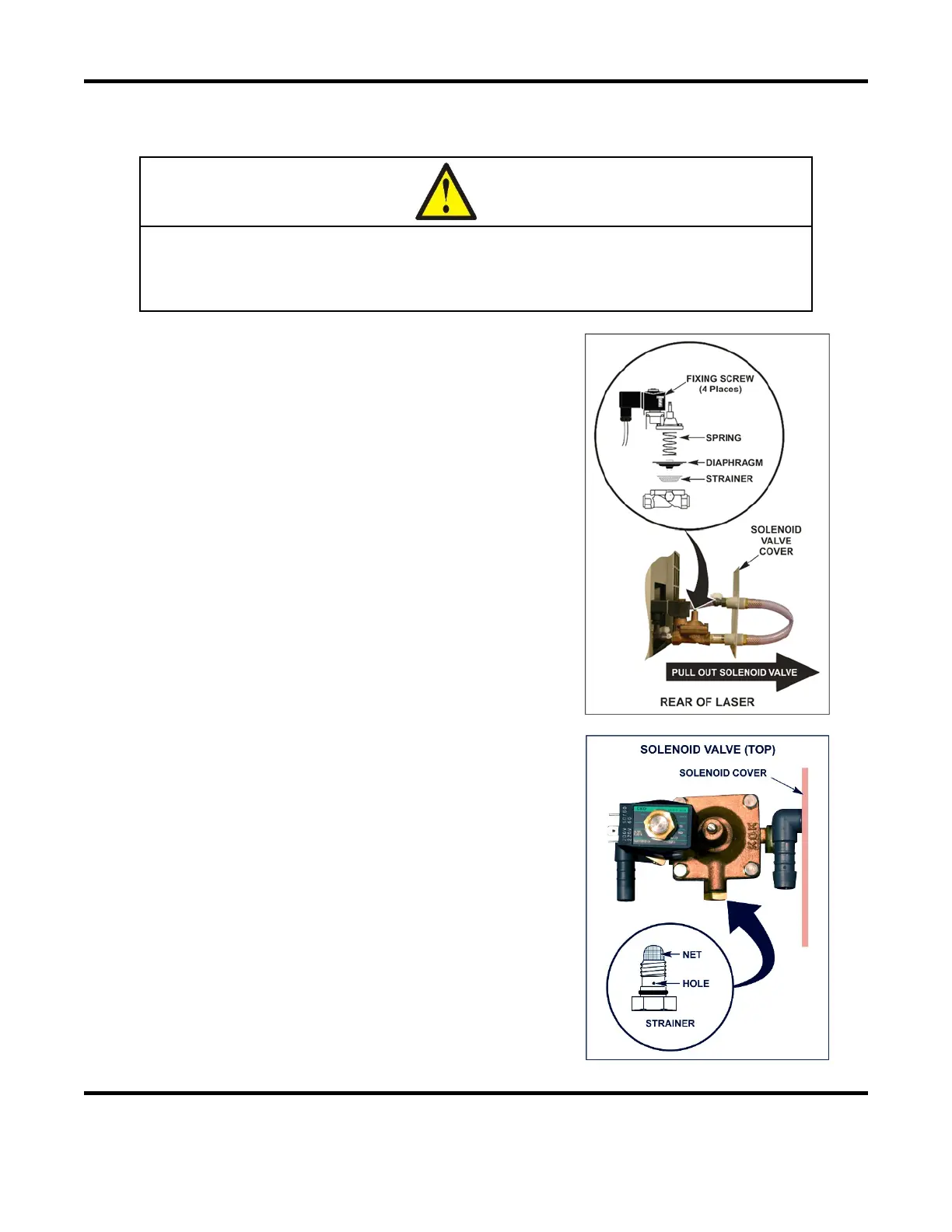 The Laser may overheat if the solenoid valve is clogged with dirt or the flow rate of