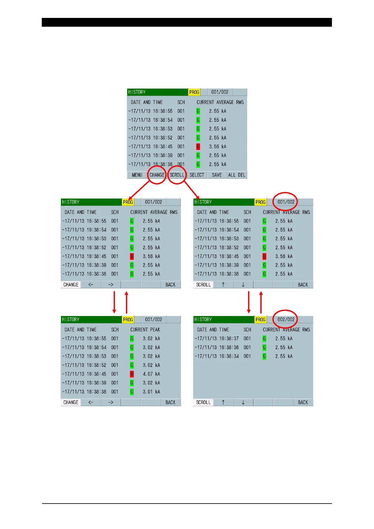Scrolling the HISTORY screen.